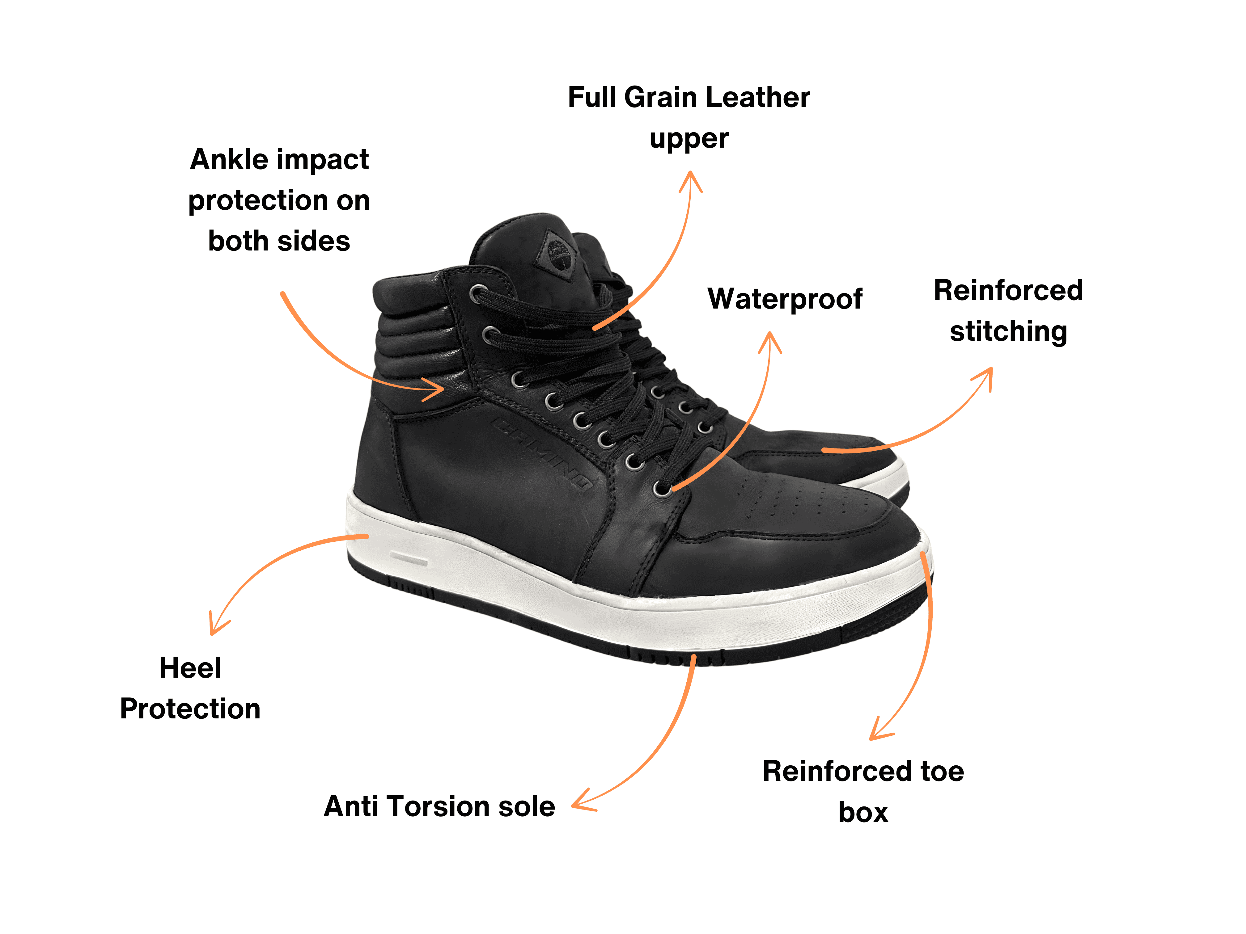A high-cut sneaker boot crafted from 100 % full-grain leather for serious protection with street-ready style. Reinforced ankle, heel & toe zones keep you safe, while the white sole and padded comfort let you ride or walk all day.