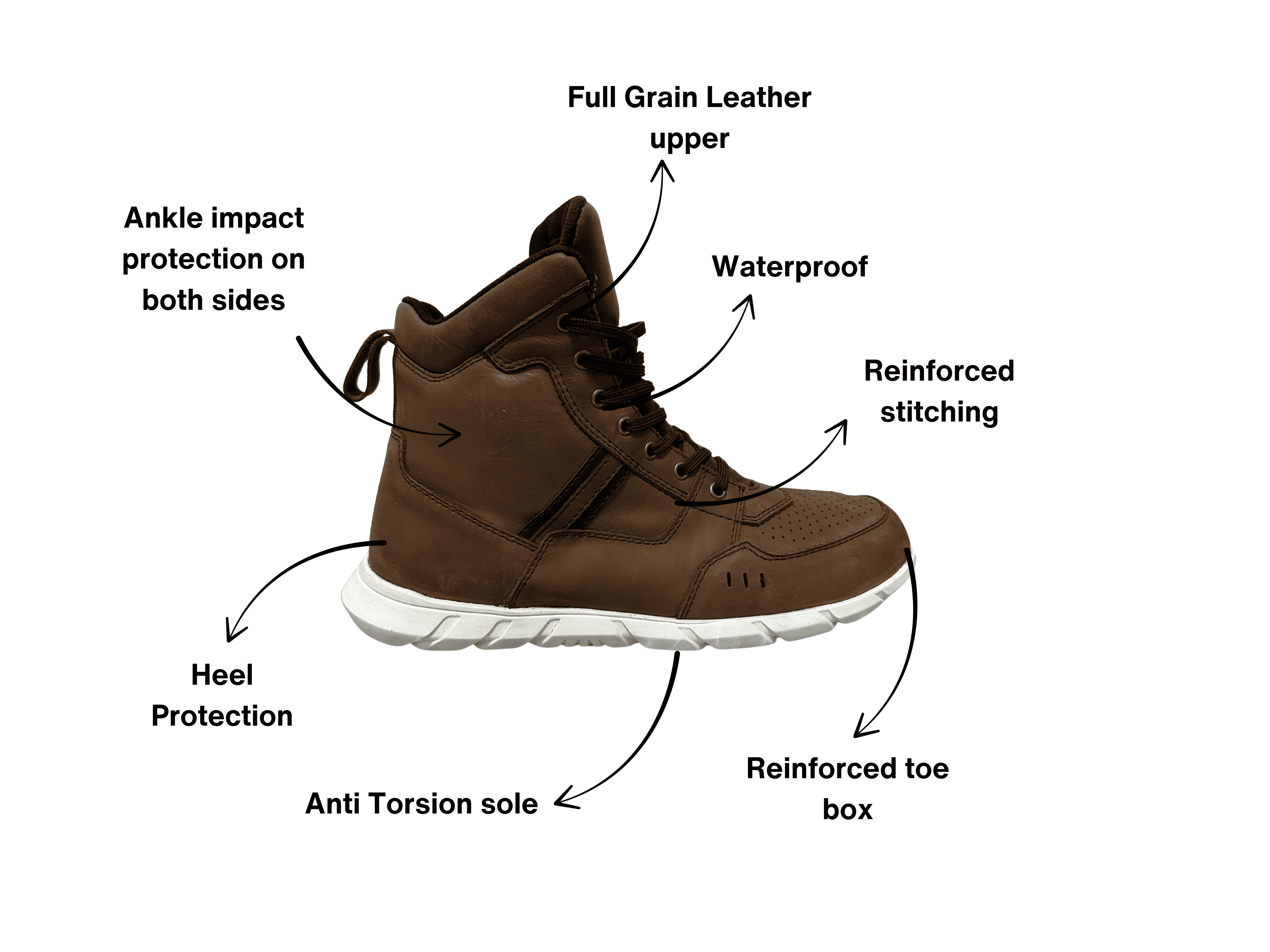 A casual high-cut boot built for riders who want comfort from morning to night. Crafted from premium full-grain leather, it softens and molds to your foot with every wear. Reinforced ankle, heel, and toe zones deliver serious protection on the bike, while the cushioned interior and flexible white sole keep you moving effortlessly through the day — from the ride to wherever you end up.